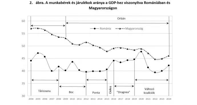 Ahogy a 4. ábrán látható, ez 2019-ben a román GDP 3,3, 2024-ben 2,5 százalékát tette ki. Az ország kivándorlókban és külföldön dolgozókban megmutatkozó „kintlévősége” a 2000 és 2024 közötti politikai ciklus alatt 1,1 millióról 4,6 millióra (a hivatalos rezidens népesség 24 százalékára) növekedett, ami arra utal, hogy a sikeres utolérő fejlődés áraként az ország jelentős mértékben felélte saját demográfiai tartalékait. A vándormozgalmakkal kapcsolatos neoklasszikus, a globális munkaerőpiac fikcióját kergető szakirodalom természetesen ez esetben is a pozitív hatásokat emeli ki.