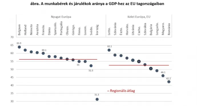 A 2. ábra ennek a mutatónak az alakulását hasonlítja össze Magyarország és Románia vonatkozásában. Magyarország esetében egyértelműen kirajzolódik a munkabérek arányának drasztikus és folyamatos csökkenése, ami a Gyurcsány-Bajnai féle válságperiódusban kezdődött, és a NER regnálása alatt folytatódott, élesen szemléltetve, hogy az Orbán-féle „munkaalapú társadalom” valójában a tőke számára biztosít extraprofitot. Ennek haszonélvezői a duális gazdaságszerkezetből fakadóan egyrészt a multik, másrészt a Fidesz klientúrájába tartozó honi tőkések. Romániában a mutató értéke nagyon alacsony bázisértékről indult és a Dragnea-korszakig stagnált, vagy inkább csökkenő mozgást mutatott. Ezt követően itt is egyértelműen megmutatkozik a minimálbérre és a béremelésre vonatkozó döntések hatása: nő a munkabérek GDP-hez viszonyított aránya. 2020-tól azonban a mutató ismét csökkenő tendenciát mutat, 2024-ben pedig Románia az EU-ban az utolsó előtti helyen található, mélyen az Uniós és a posztszocialista országok átlaga alatt. Az utolsó helyre a kiemelkedő mértékben a high tech szolgáltatások és termékek exportjára szakosodott Írország került (3. ábra).