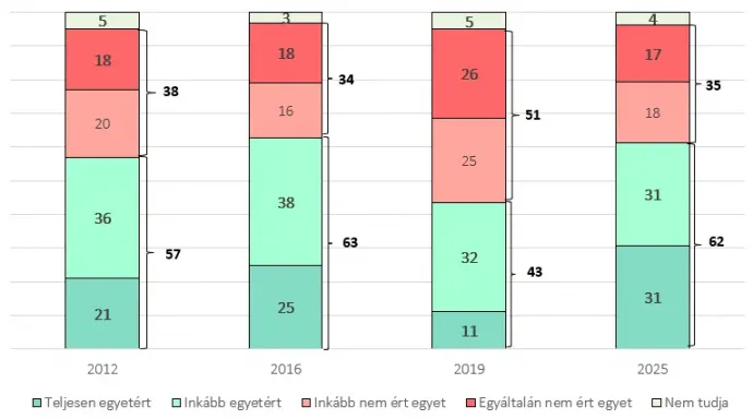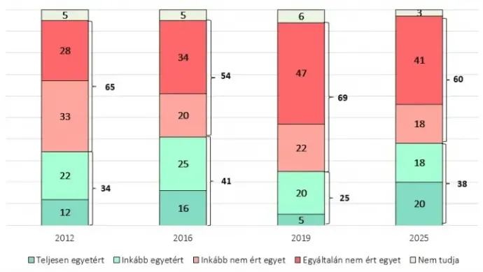 Az adatok alapján egyértelműnek tűnik, hogy a magyar viszonyok legfontosabb neuralgikus pontjává a szavazati jog vált. 2025 májusában a magyarországi választók 60 százaléka utasította el, és csupán 38 százaléka helyeselte, hogy a határon túli magyarok szavazhatnak a magyarországi választásokon. Ez az időbeli összehasonlítás szerint nem is a legkedvezőbb arány, hiszen 2016-ban ennél valamivel magasabb volt a támogatók aránya. Figyelemre méltó az is, hogy a legtöbben (a választók 41 százaléka) egyáltalán nem értenek egyet a határon túli magyarok szavazati jogával.