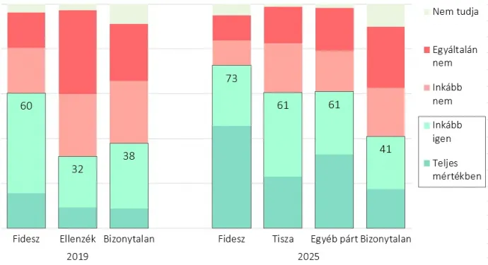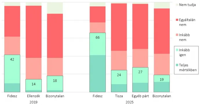 2019-hez viszonyítva a kormánypárti és ellenzéki szavazók támogatáspolitikához való viszonyulása radikálisan átalakult. 2019-ben egy, a Fidesz számára nagyon kedvezőtlen összefüggés volt megfigyelhető: az ellenzéki szavazótábor ugyanis szinte egységesen elutasította a határon túli magyarok anyagi támogatását, míg a kormánypárti tábor – ha a támogatók relatív többséget képeztek is – erősen megosztott volt. 2025-re azonban az ellenzékiek között növekedett nagyobb arányban a támogatásokat elfogadók aránya. Így nem csupán a Fidesz táborában vannak többségben a pozitívan viszonyulók, hanem a Tisza és az egyéb ellenzéki pártok szavazói között is. Vagyis a kutatás eredményei szerint lényegében ebben a kérdésben is megszűnt a korábban jellemző, erőteljes politikai polarizáció.