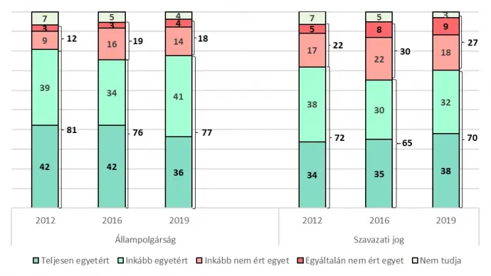 Ugyan 2019-hez képest a könnyített honosítás és a magyar kisebbségeknek nyújtott támogatások elfogadottsága növekedett, ezekkel kapcsolatban sem alakult ki társadalmi konszenzus, a határon túli magyarok szavazati jogát pedig továbbra is ellenzi a magyarországi választók többsége. Ez utóbbi kérdésben ráadásul erősödött a pártpolitikai polarizáció. Összehasonlításképpen utalhatunk a romániai adatokra (2012-ben és 2016-ban a Nemzeti Kisebbségkutató Intézet, 2019-ben a Bálványos Intézet és a Székelyföldi Közpolitikai Intézet végzett Romániára reprezentatív adatfelvételt – szerk. megj.), ahol ugyan van némi csökkenés, de a válaszadók túlnyomó többsége támogatja a szomszédos országokban élő románok állampolgárságát és szavazati jogát.